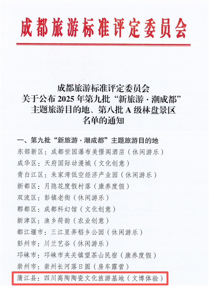 近日,四川高陶陶瓷文化旅游基地(成都高陶博物馆)成功获评第九批“新旅游·潮成都”主题旅游目的地(文博体验类)。