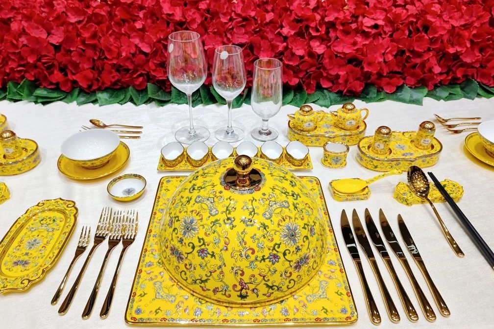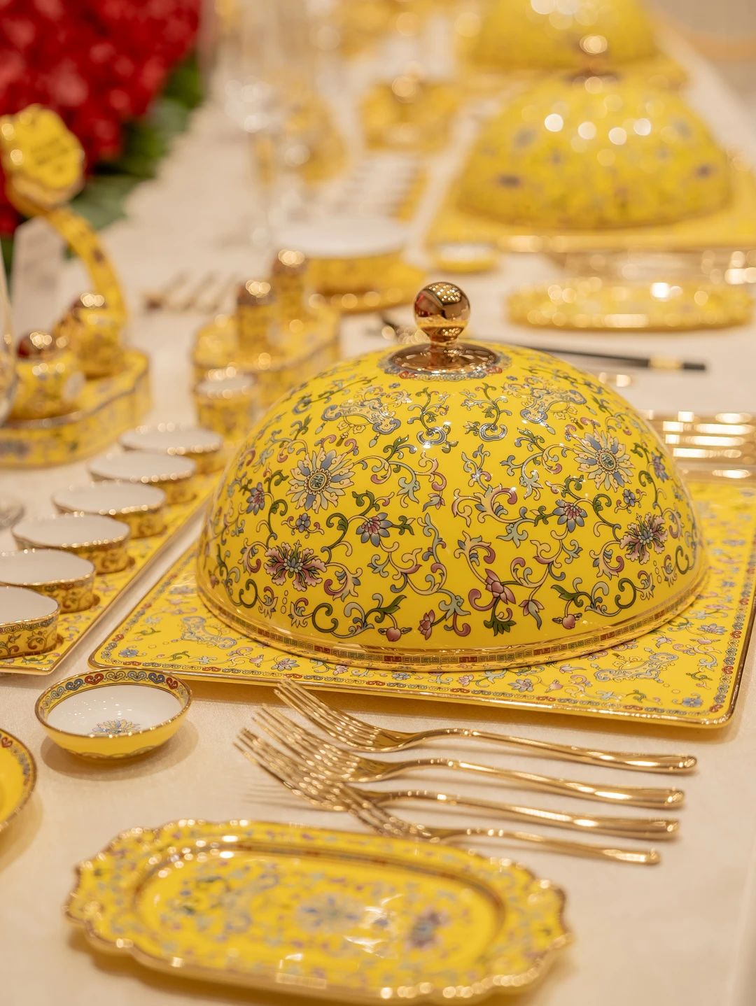 流光溢彩的“盛世如意”珐琅彩国宴瓷更是让人眼前一亮,“国韵黄”底色亮眼却不刺目,温润中自带一份雍容气度,瓷面上云纹、如意纹蜿蜒伸展,线条如水般流动,古韵悠长里跳跃着现代时尚的脉搏。
